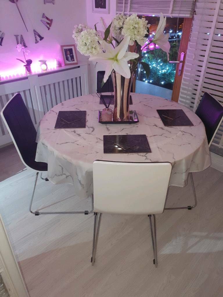 The monza 150cm white high gloss dining table is also available to purchase with a range of dining chairs including the malaga chairs and hampstead z chairs to create a distinctly stylish dining set. Accommodating 4 diners, the compact round table is ideal for smaller dining areas. Goldfan dining table and chairs set 4 high gloss kitchen table and pu leather cushion chairs dining table set, white/120cm 4.4 out of 5 stars 35 £202.00 £ 202. Vivienne extending white high gloss dining table with 2 grey velvet dining chairs and a matching high back bench. Novara chrome metal 100cm round glass dining table and 4 corona silver dining chairs.