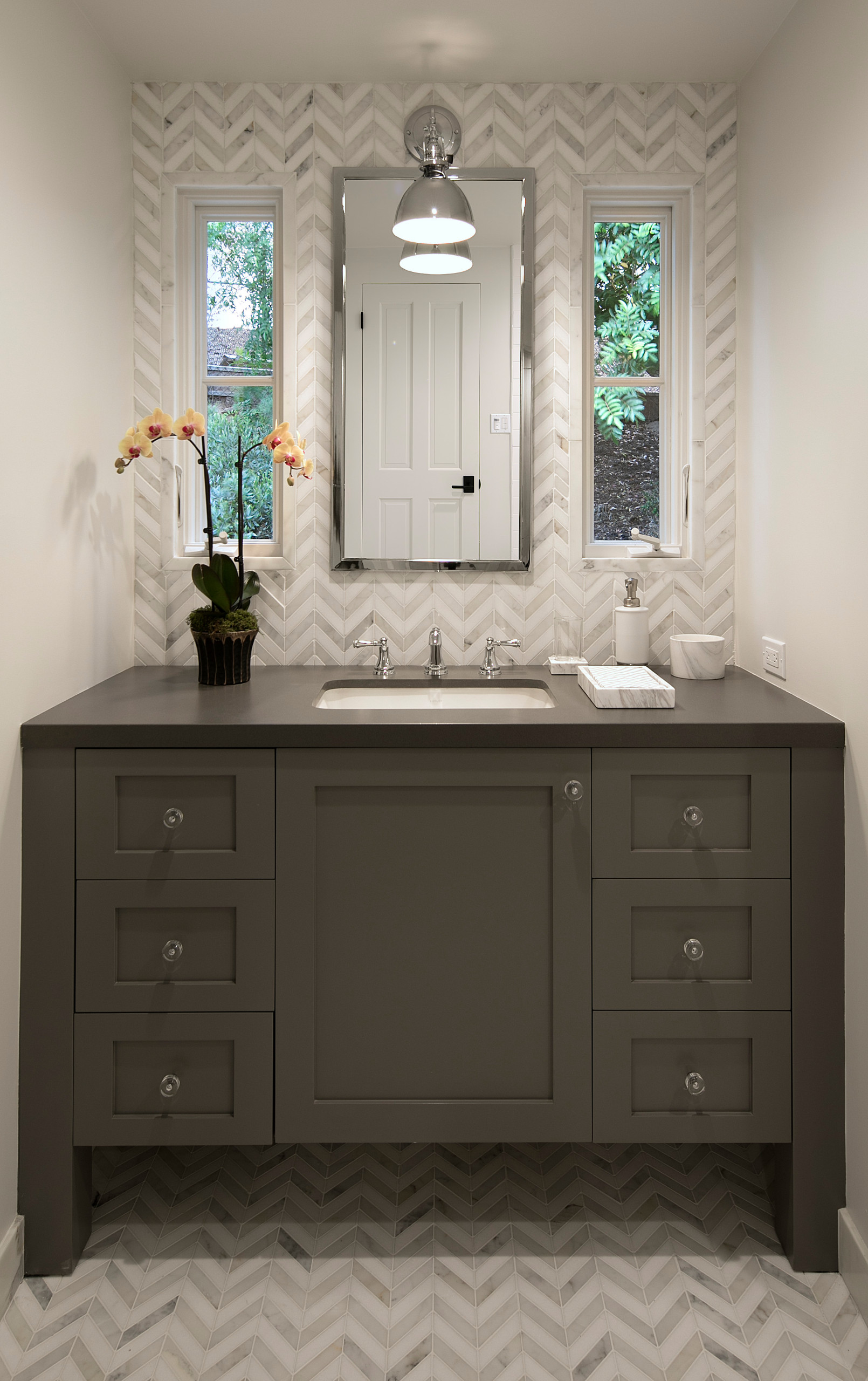 A silver beveled mirror adds a polished finishing touch.